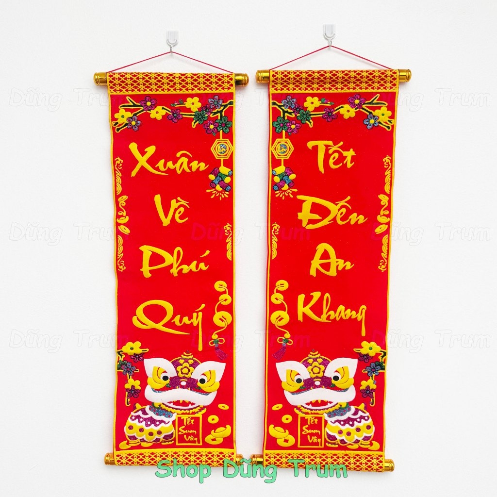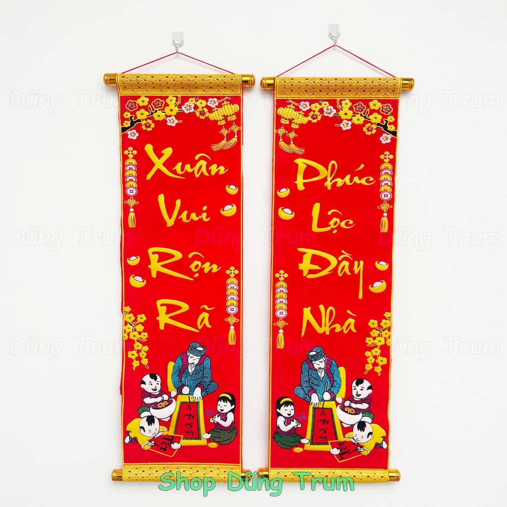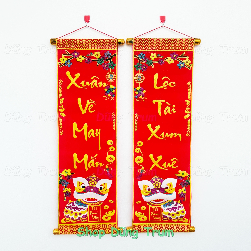 * Câu đối được làm bằng vải nhung, in chữ Việt Nam sắc nét, với các hoa văn đậm chất ngày tết cổ truyền Việt Nam.