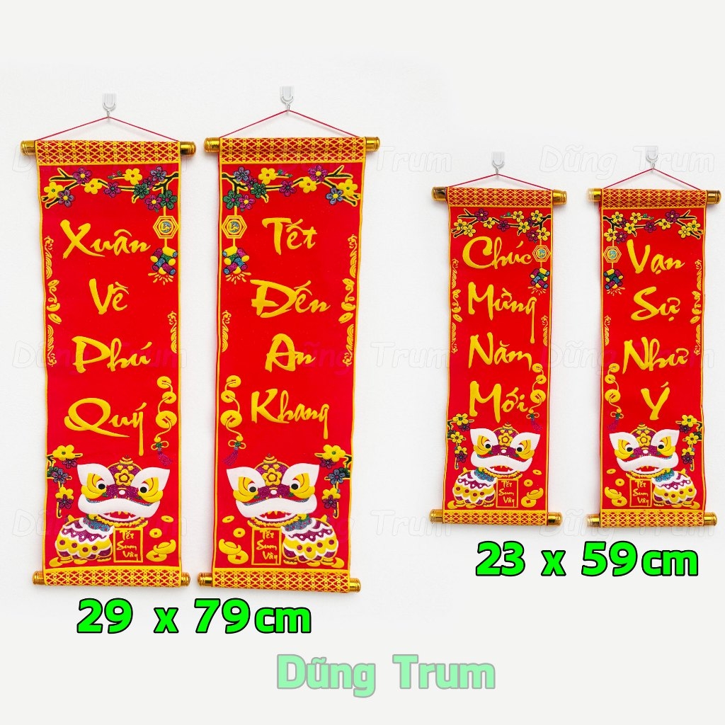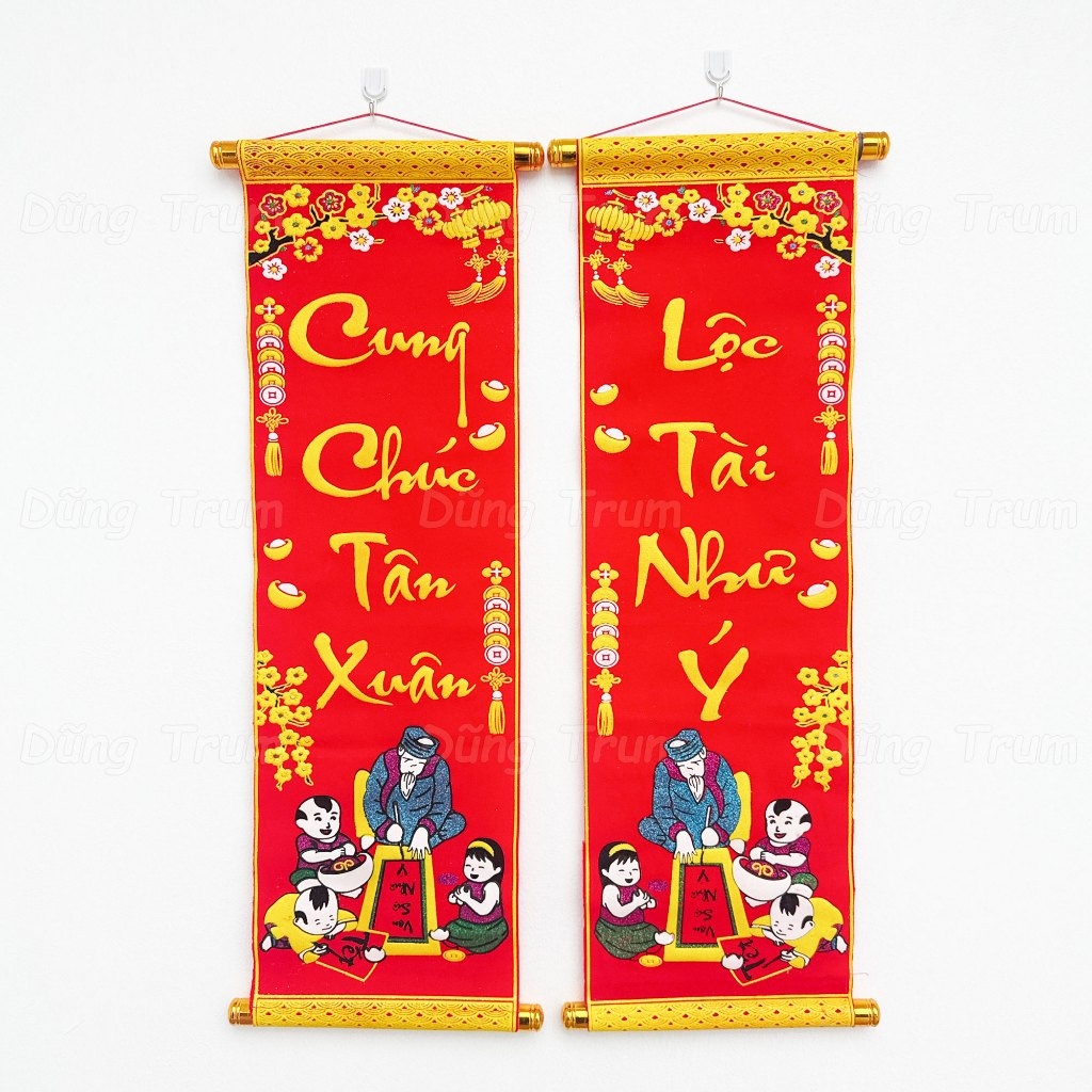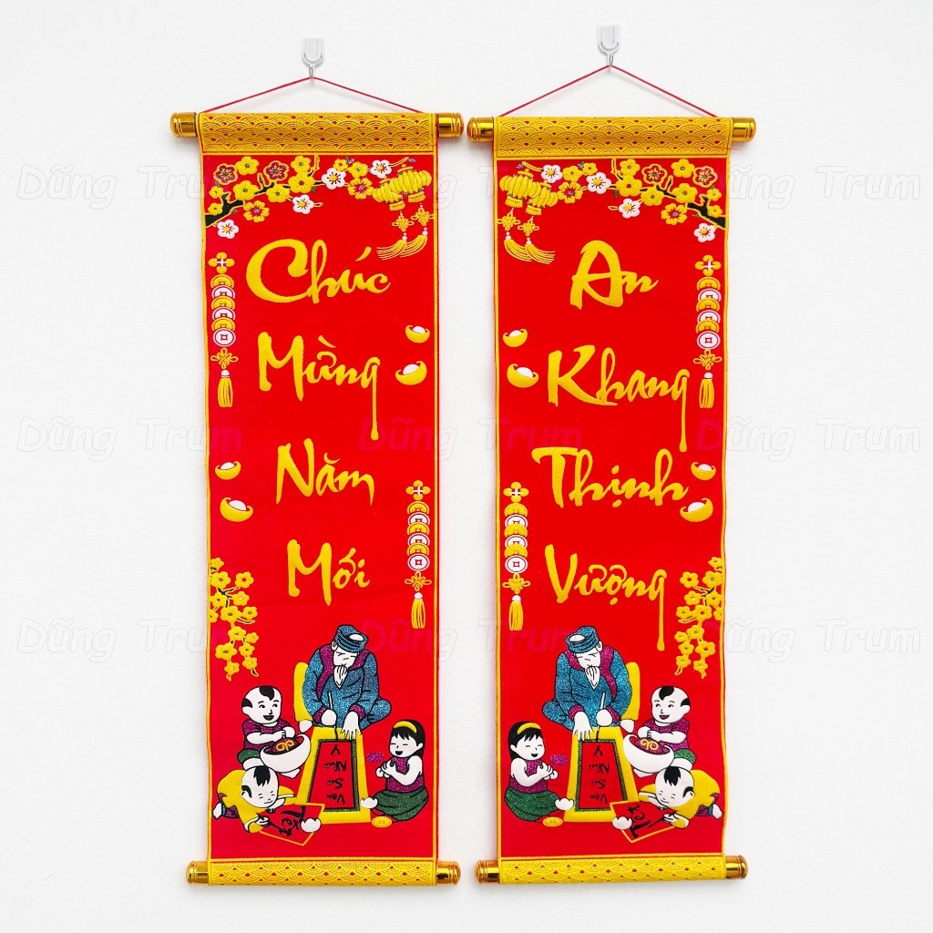 * Câu đối được làm bằng vải nhung, in chữ Việt Nam sắc nét, với các hoa văn đậm chất ngày tết cổ truyền Việt Nam.