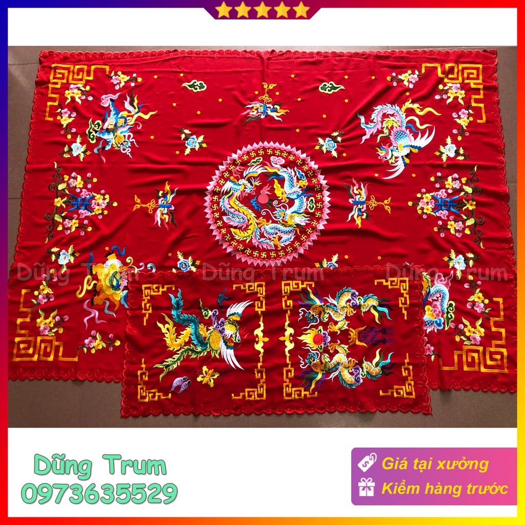 Khăn phủ diện đẹp vải dâu thêu chỉ vàng gồm khăn phủ và khăn tấu